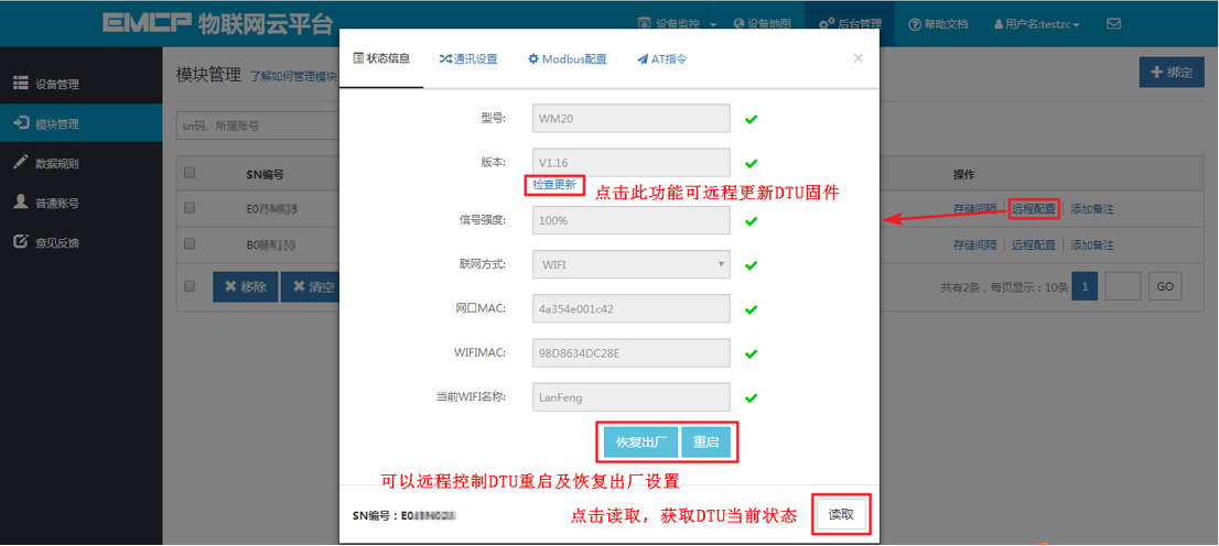 第一步,绑定好模块后,点击【远程配置】,在【状态信息】页面可以点击【读取】,获取当前DTU状态,如图所示: