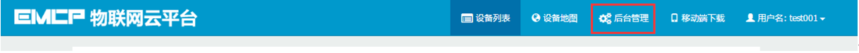 用管理员账号登录EMCP平台www.lfemcp.com (建议使用IE9以上浏览器或谷歌浏览器),对EMCP云平台进行设置。具体操作参照《EMCP物联网云平台用户手册》。登录EMCP后首先进入设备列表显示页面,因为我们未创建任何设备,所以是一个空页面。点击右上角的【后台管理】按钮(只有管理账号才有此权限),进入EMCP平台的后台。