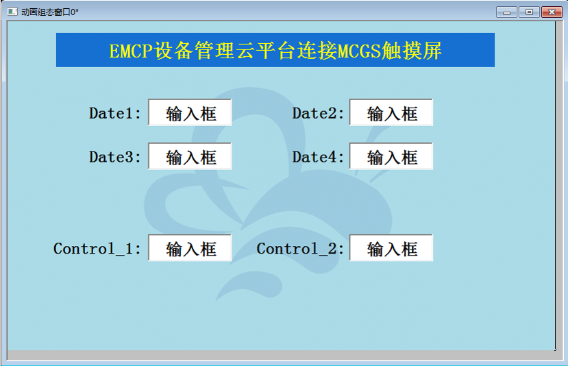 第四步,创建数显窗口,在“用户窗口中”新建窗口,双击新窗口进入动画组态页面,在组态页面中添加6个标签和输入框,对应内容为上面设定的Date1-Date4定时读取变量,Control_1和Control_2两个远程读写变量。如下图;