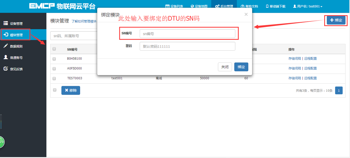 2,输入模块SN,输入要绑定的SN码,如果此SN之前未绑定,则会弹出绑定窗口进行绑定;
