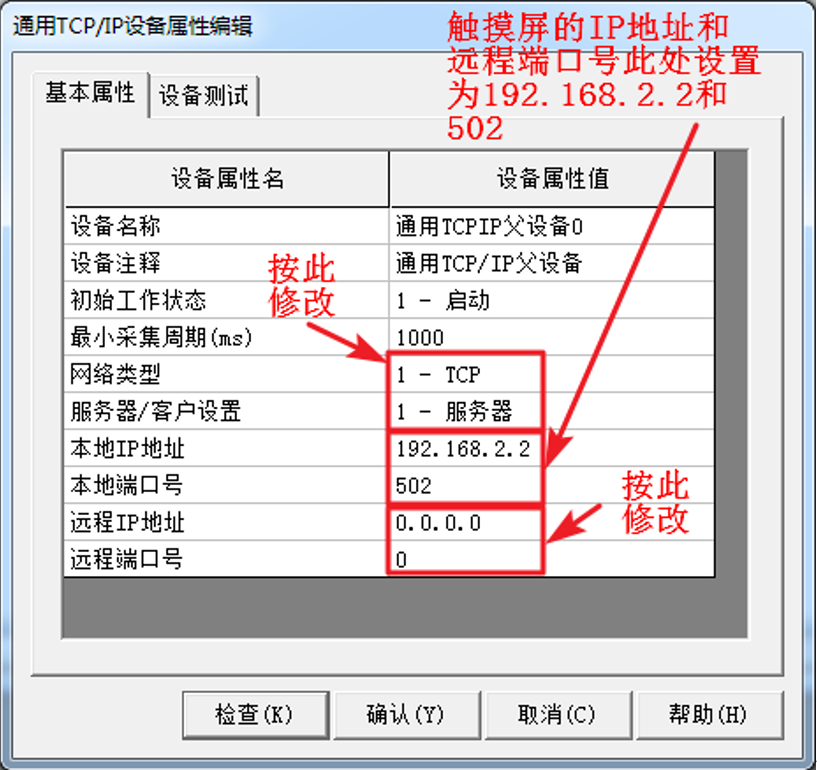 第二步,设置“通用TCP/IP父设备”属性,双击“通用TCPIP父设备0-[通用TCP/IP父设备]”打开属性编辑窗口,设置按如下配置。其中触摸屏的IP地址可根据实际需要进行修改,此处记住触摸屏设置的IP地址和端口号,后面设置平台参数时会用到。