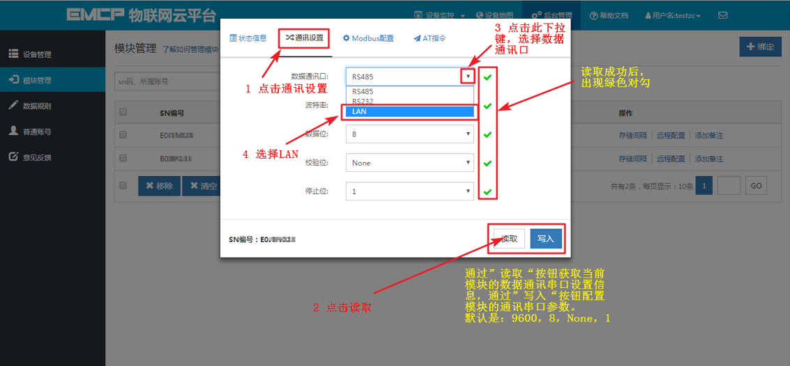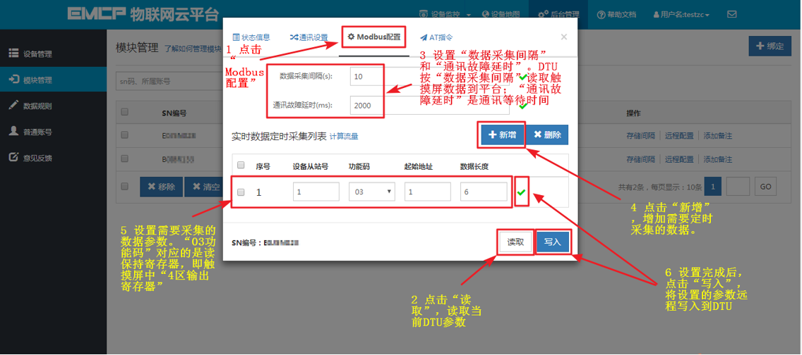 打开“【后台管理】—>【模块管理】”页面,将DTU绑定至此管理员账号,然后就可以使用【远程配置】功能来配置DTU的各项通讯参数和功能参数。最主要两个地方需要配置,一是与MCGS触摸屏通讯的参数,二是设置DTU定时采集触摸屏数据的Modbus通道参数,下面分步骤对此功能进行讲解。