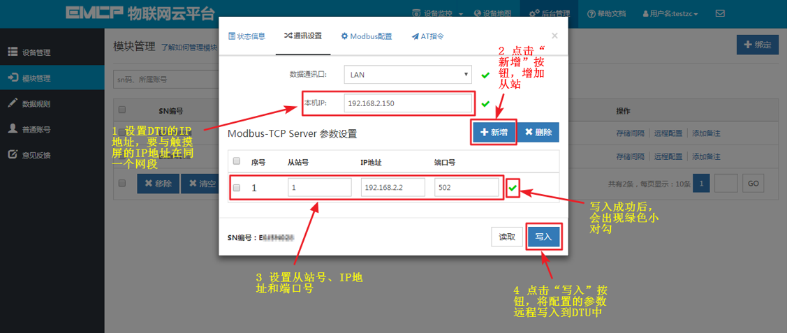 上图中【本机IP】是指设置给DTU的IP地址。新增的从站中的IP地址,是指触摸屏中之前已经设置好的IP地址,即192.168.2.2,端口号也是之前分配好的,是502。注意:【本机IP】设置时最后段位要与触摸屏的不同,其他段位要相同,即要在同一个网段。从站号是设置“ModbusTCPIP数据转发设备”时的“设备地址”,即 “1”。之后在平台上进行【Modbus配置】和【数据规则】的建立时,都用此【从站号】识别触摸屏设备。